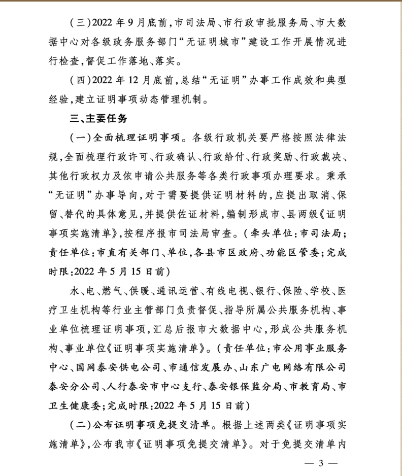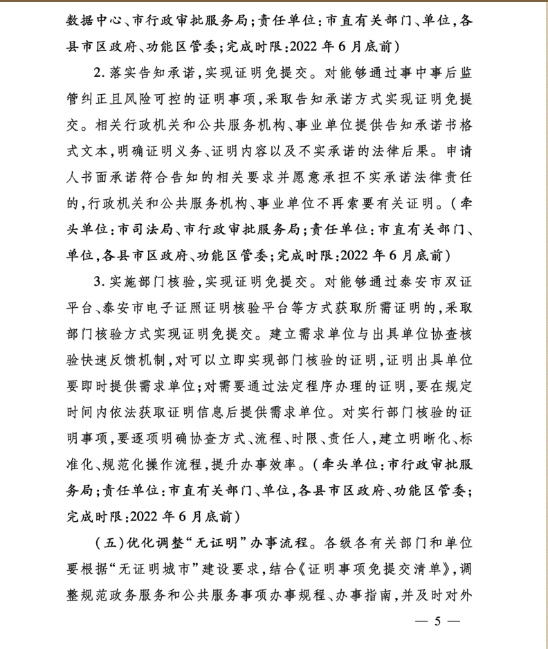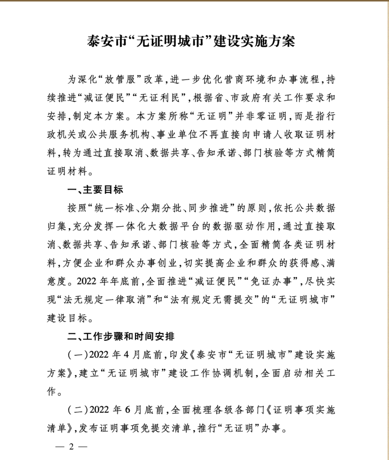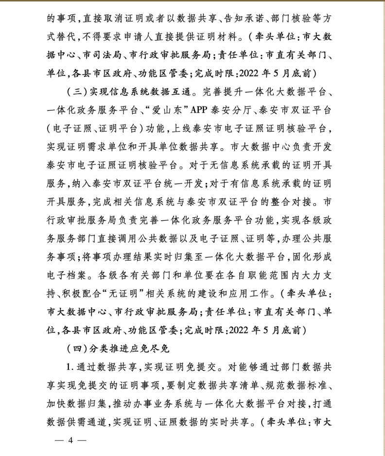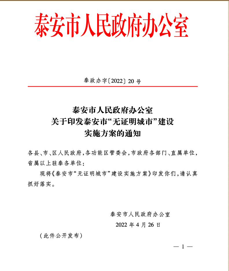 您當前位置》政策法規(guī)》泰安市人民政府辦公室關于印發(fā)泰安市“無證明城市”建設實施方案的通知
